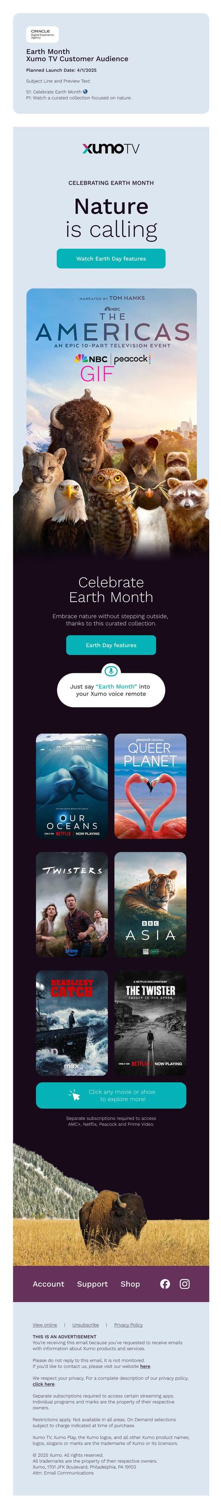 4th December 2025 Xumo Earth Month Promotion An email promoting content for Earth Month, which earned a Silver award at the 2025 W3 Awards.