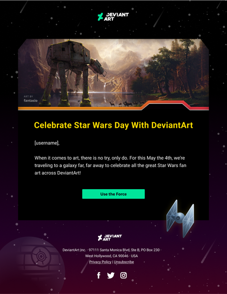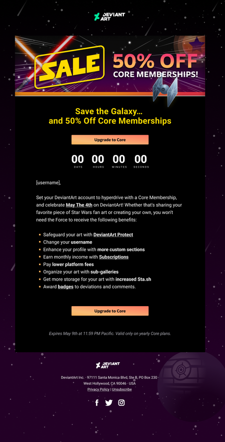 16th August 2022 Star Wars Day Core Sale Email campaign tying May the 4th be with you to a 50% off Core (DeviantArt's premium plan) sale.