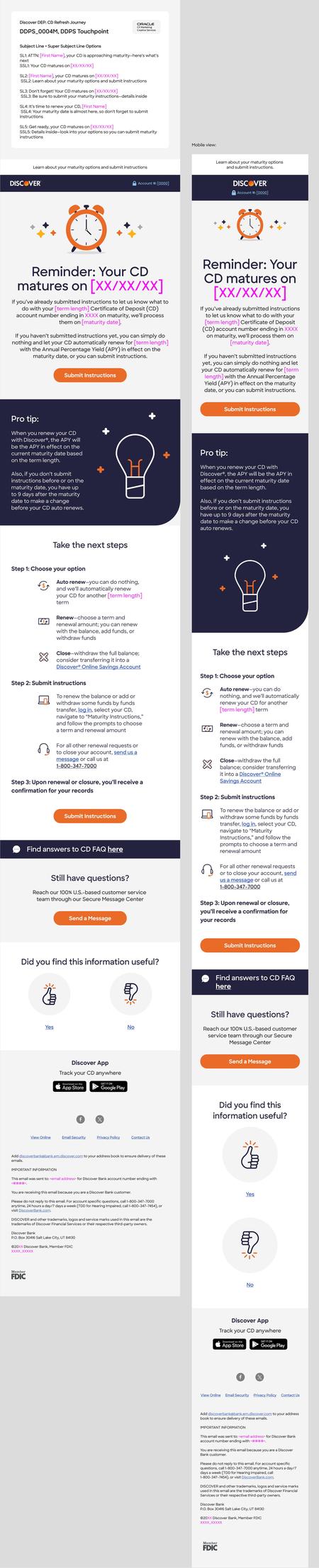 Discover • 5th September 2024 Discover Bank Email for CD Refresh Journey This email was part of a series of refreshes for Discover, educating customers on what to do as their CD approaches maturity.