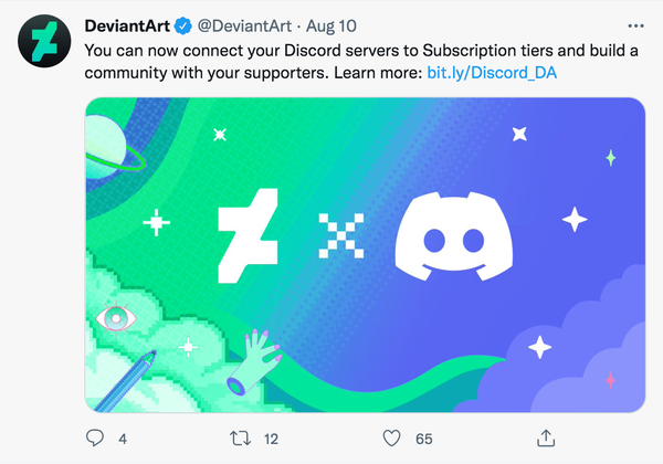 18th August 2022 Discord Integration Promotion Social ad sharing the news that Discord can be connected to DeviantArt Subscriptions.